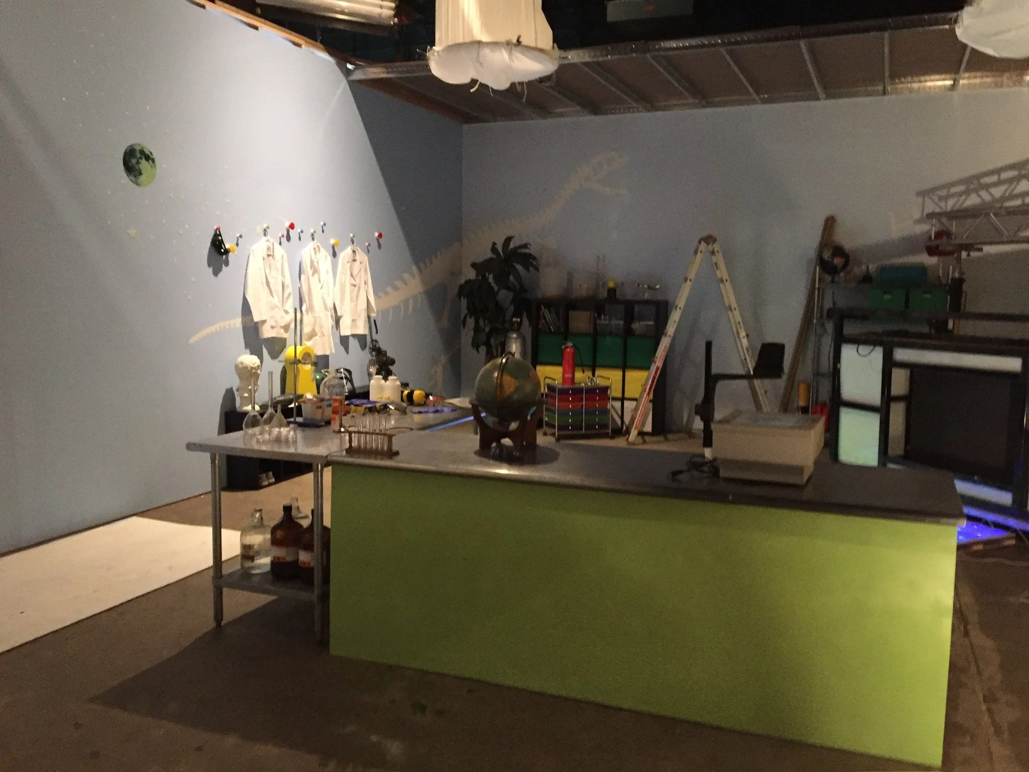 For this set, we built the walls and painted them with custom murals. On one wall, we painted a long necked dinosaur skeleton. On the other corner, the caffeine molecule.