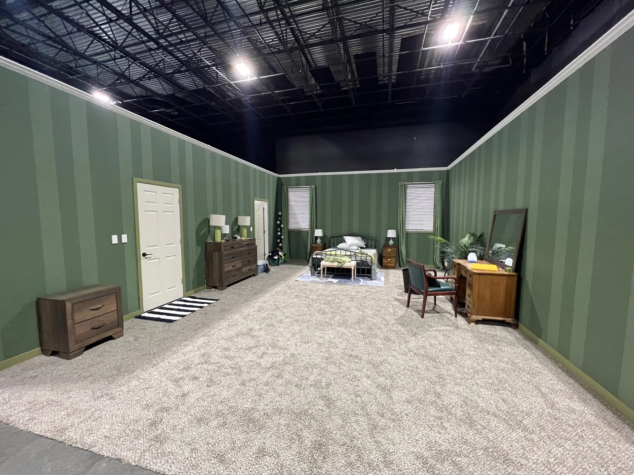 The scenes on this stage were all shot to be black and white. I designed it in such a way to translate into a monochromatic world, yet I wanted to bring a sense of uneasiness to the cast and crew by decorating it in various shades of ever so slightly clashing greens. We brought an unsettling sense of scale with the painted stripes found on the wall, taped off and hand painted at strange intervals.