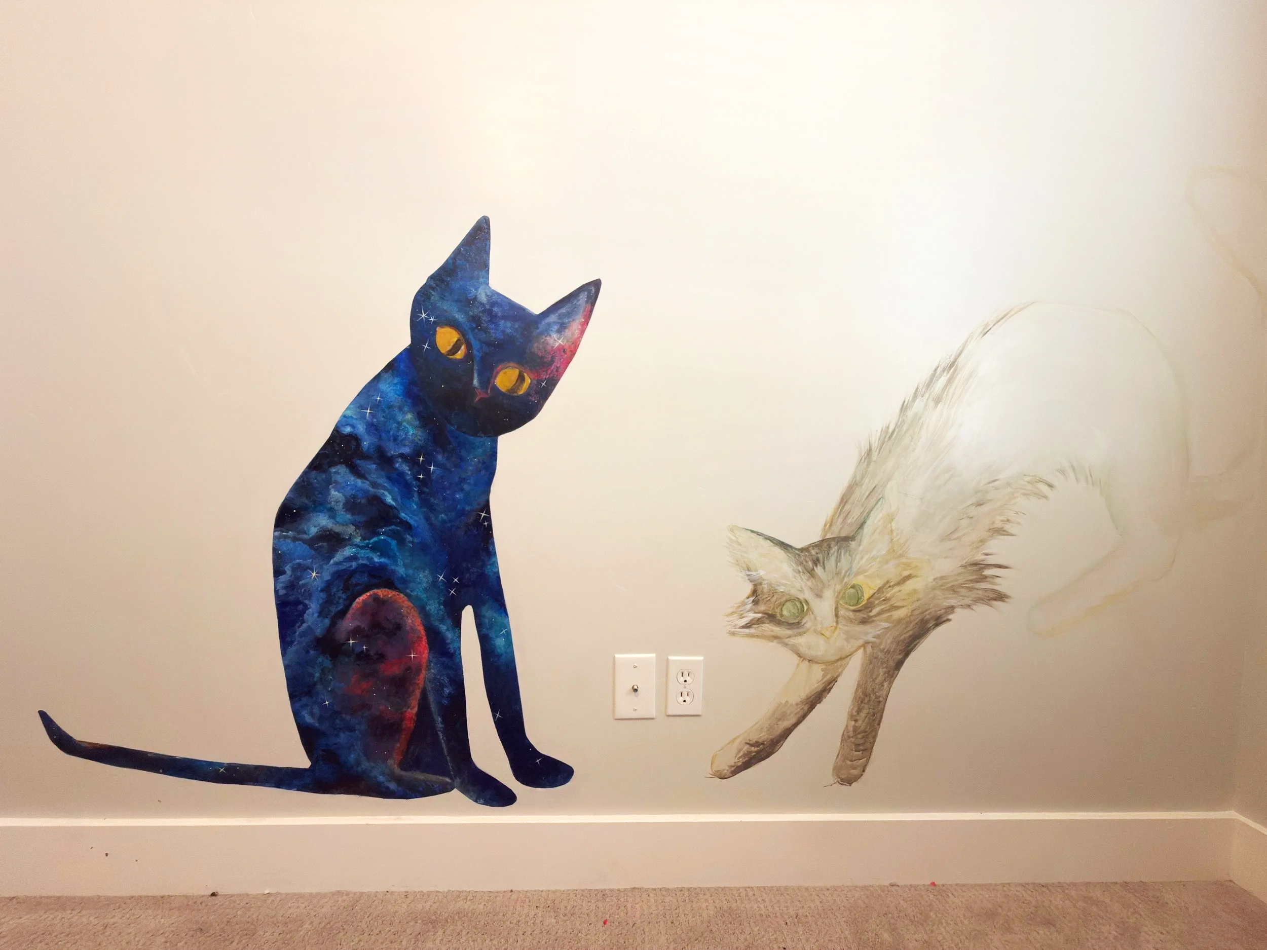 Cat Murals in a child’s bedroom. These are her two favorite childhood kitties, “Tito” and “Pewpetua”.